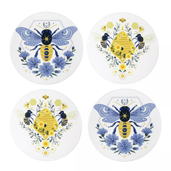 This lovely set of 4 coasters featuring honey bees, are a beautiful way to brighten up your table.