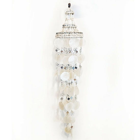 Bring some rustic Coastal beauty into your home and enjoy the delicate sounds, with this gorgeous natural hanging shell windchime art featuring white beach shells and coloured capiz shells.