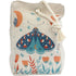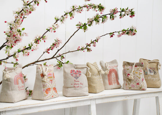 - A neutral base with a lovely palette of red, orange and pink colours featuring a beautiful vintage motifs and/or words. A chunky neutral rope handle completes the look