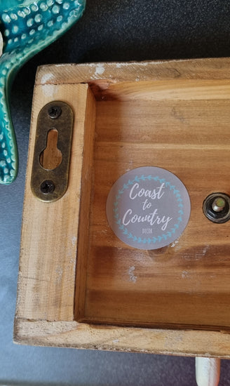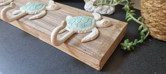 - Rustic Coastal Timber finish with 3 x white metal Sea Turtle shaped hooks. The turtles have aqua coloured shells.