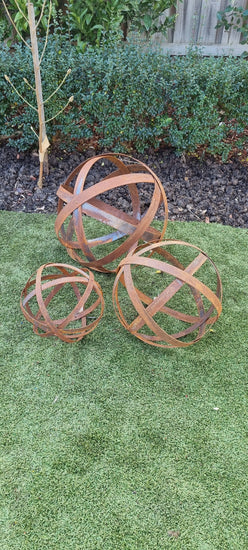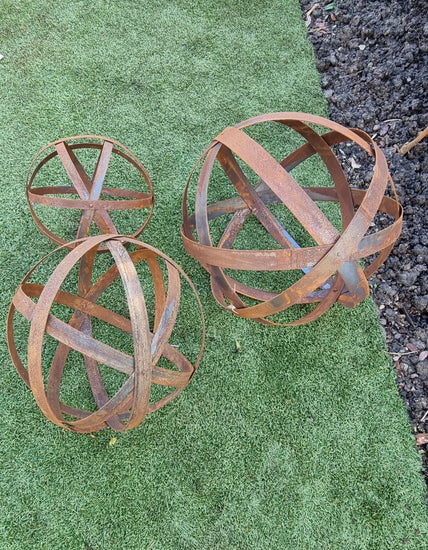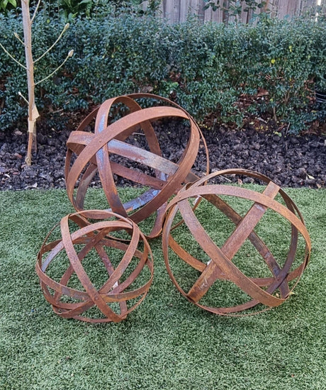 A must have addition to any garden is this set of 3 rustic, rusty brown metal spheres / balls / orbs available in 3 sizes, or a set of 3